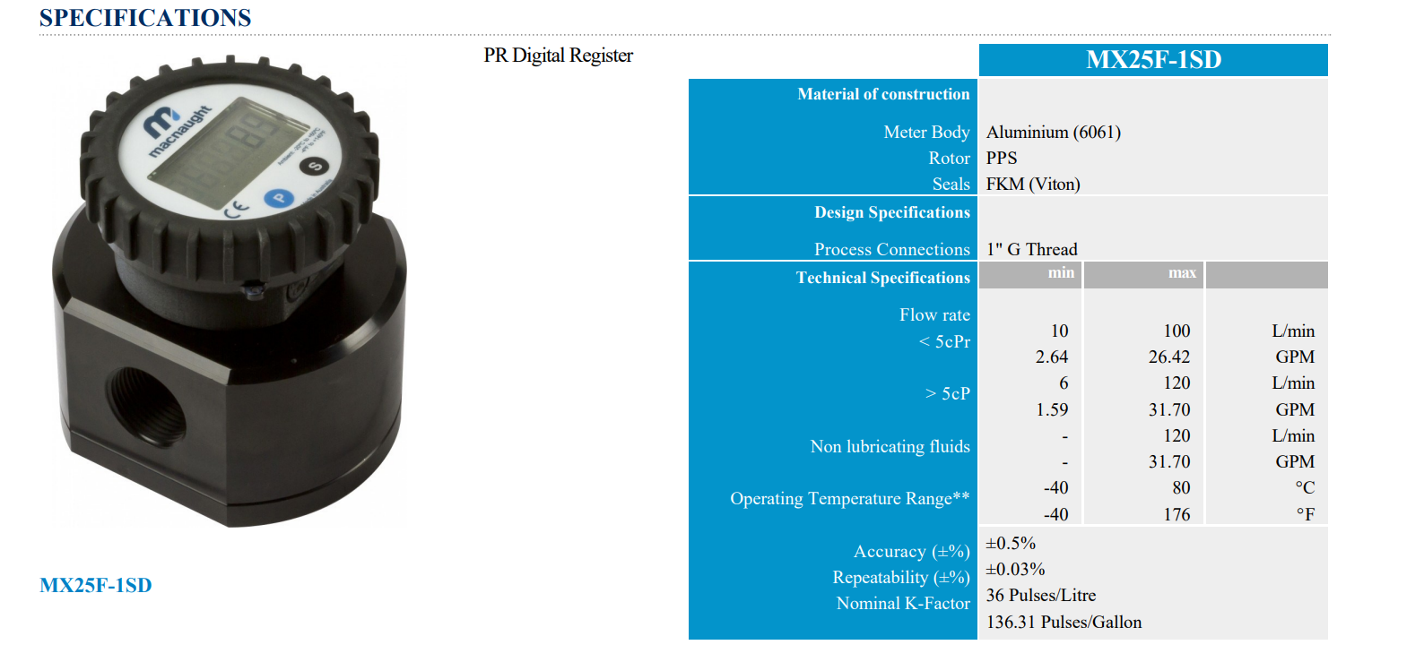 The MX Series 1" DIGITAL FLOW METER are suitable for flows between 6 - 120 L/min (1.59 - 31.70 GPM), providing highly accurate flow measurement performance.