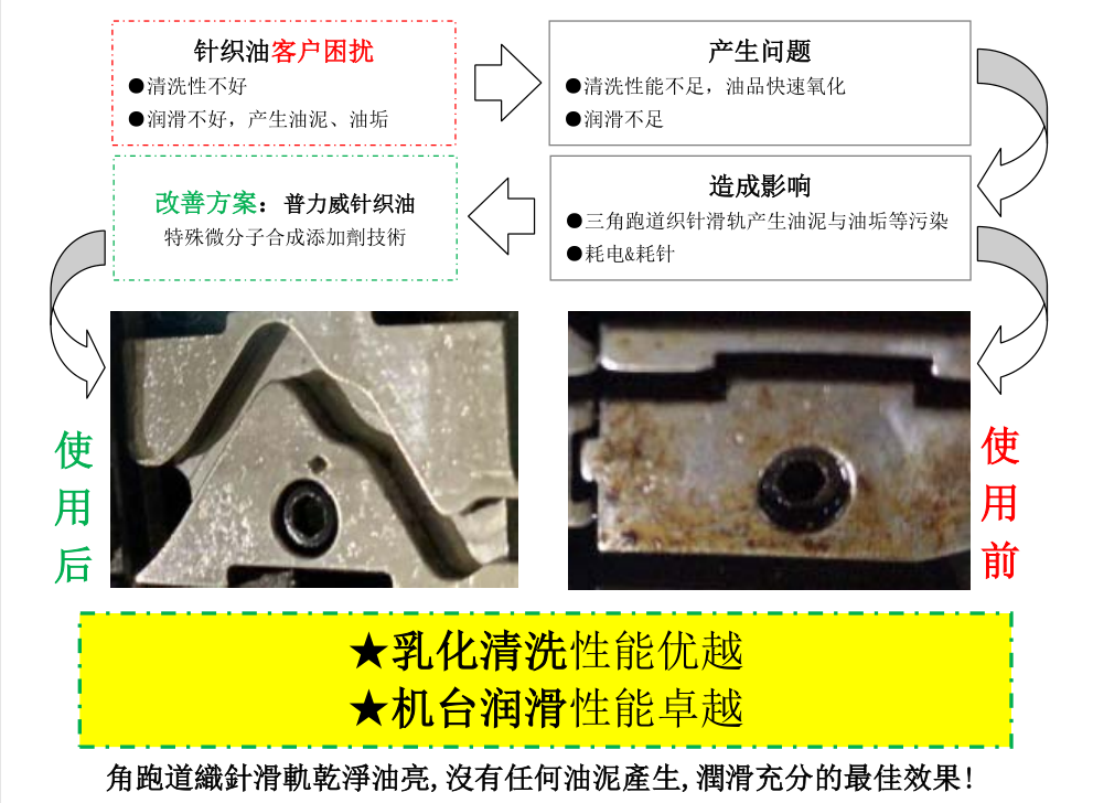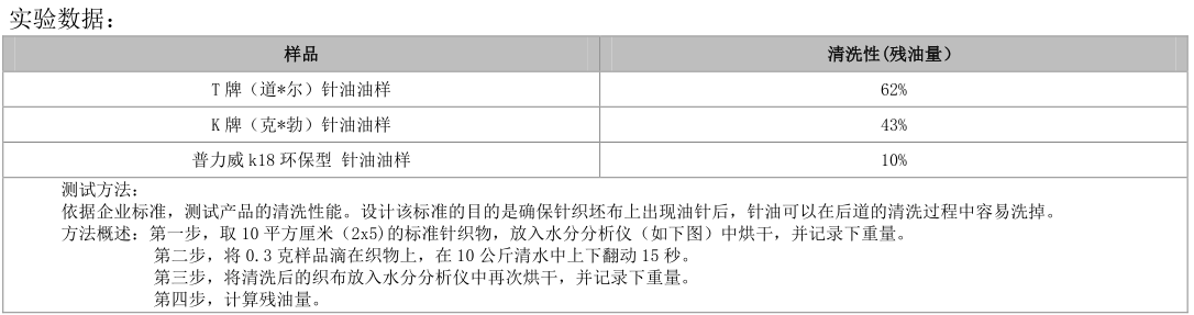 我公司针织油采用特殊微分子合成添加剂技术,胚布的油能更容易被分解到水中(非传统的水包油概念),