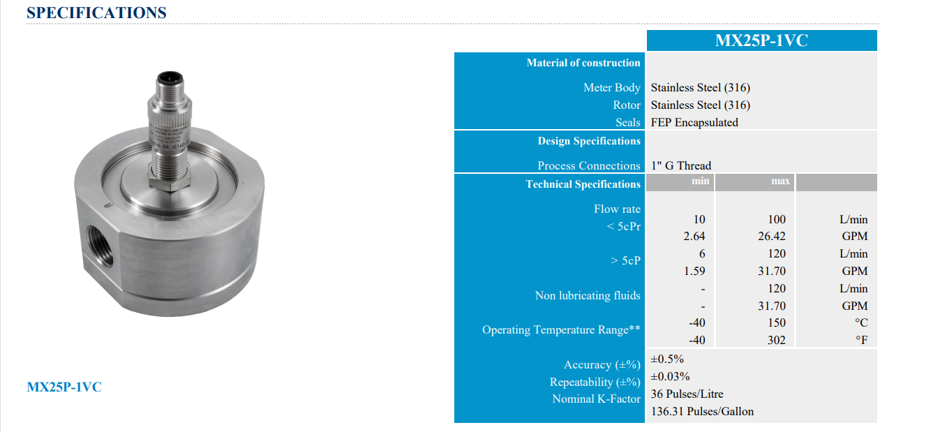 MX系列1英寸数字流量计适用于6至120 L/min(1.59至31.70 GPM)的流量,提供高度精确的流量测量性能。